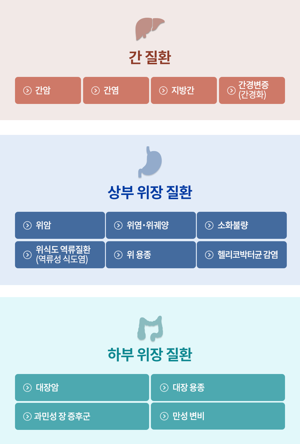 소화기 질환요즘 시대에 현대인들은 육류 위주의 식습관과 맵고 짠 음식을 자주 먹는 경우가 많으며, 스트레스를 과식, 음주 등 불규칙한 식습관으로 푸는 경우가 많아 다양한 소화기 질환에 노출되어 있습니다.